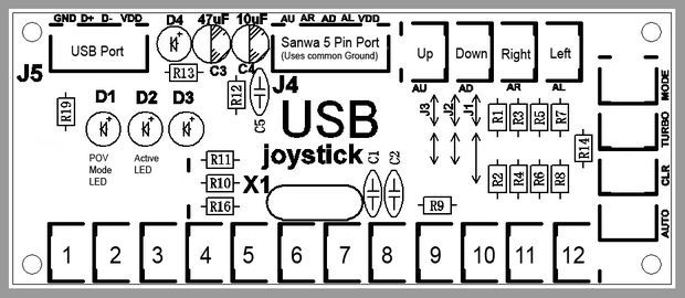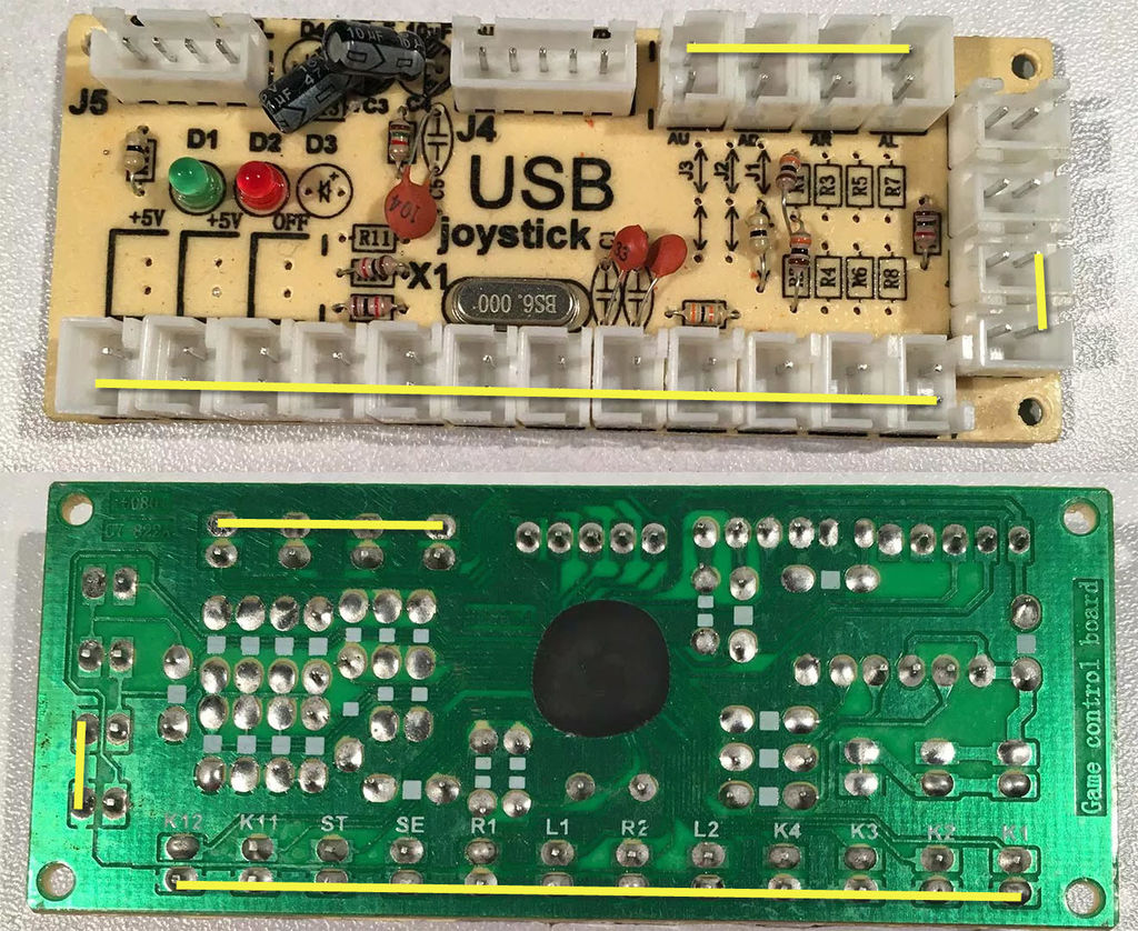 NOTE : Sur le circuit imprimé, la « masse commune » est en fait du +5V provenant directement du port USB. C’est l’opposé du contrôleur Neo Geo qui a une seule masse et plusieurs « lignes électriques » pour avoir des bits passant à « 1 » (il y a du courant qui entre). Ce n’est normalement pas un problème puisque c’est le comportement attendu du codeur. Le stick ne fait que connecter les broches ensemble au niveau de l’encodeur après tout.