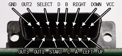 - Pin 8 : VCC [+5V; Prend l’énergie depuis le port USB; requis pour les pads Neo Geo CD]