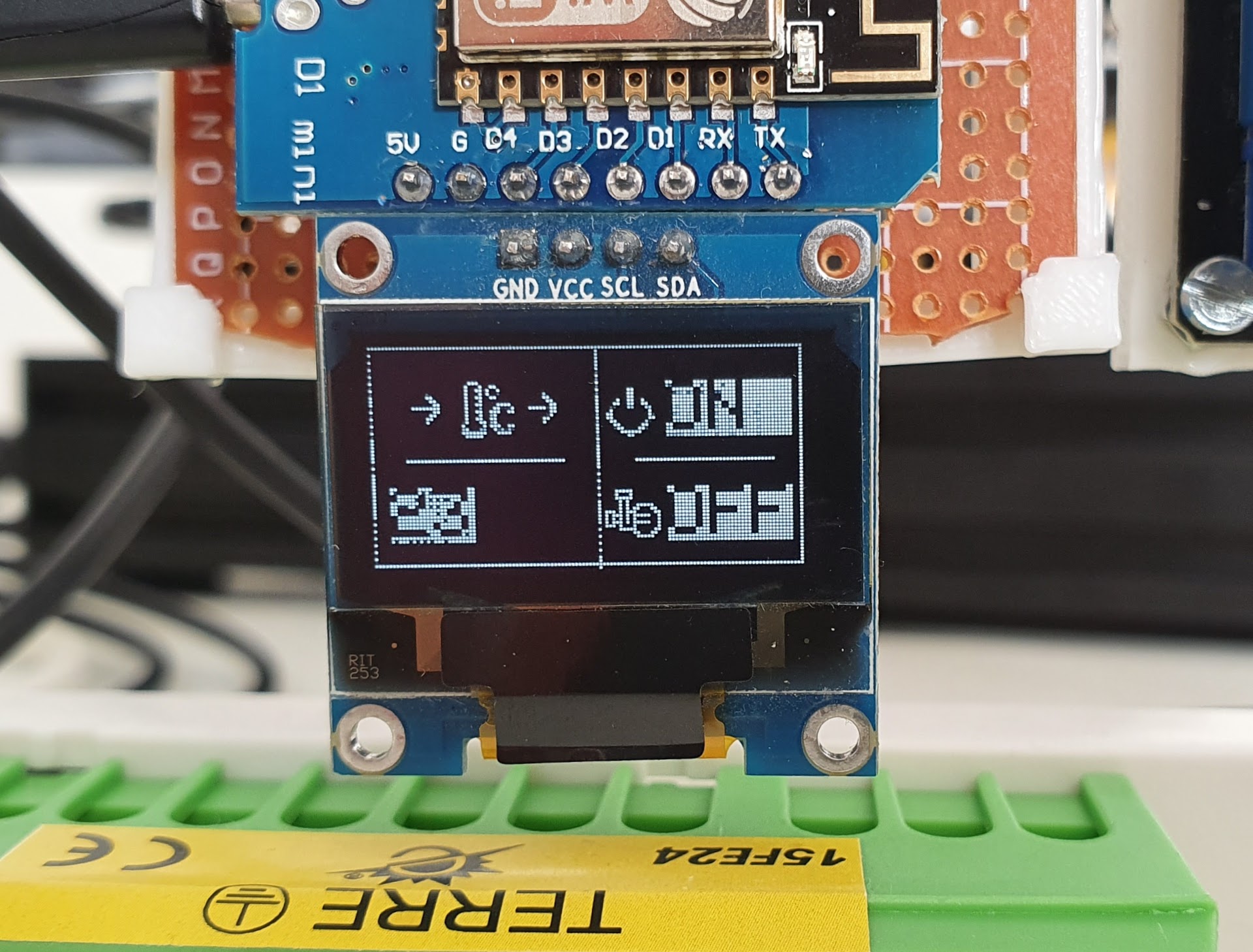 Pour me faciliter la vie lors de la connexion du bus I2C pour l’écran OLED, j’ai inversé les pins D1/D2 via le micrologiciel. Les connexions sont ainsi :