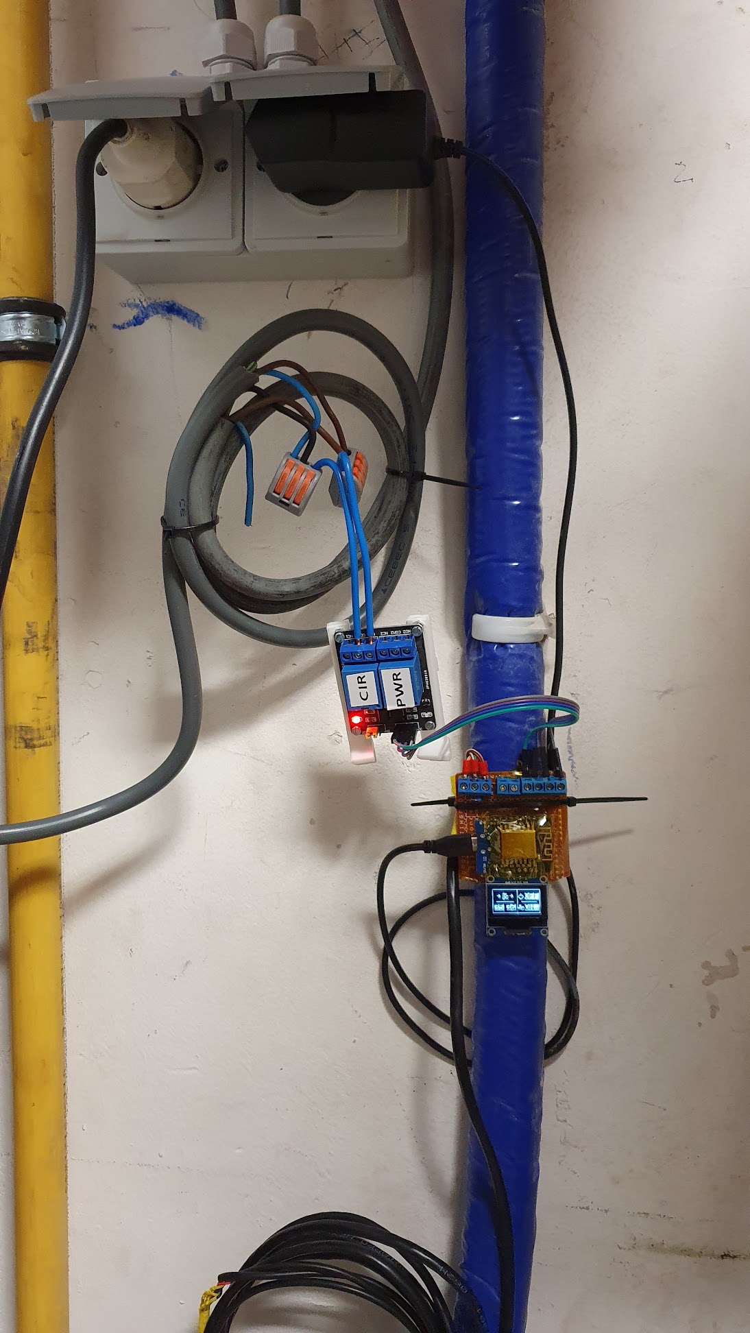 - La température de l’eau est mesurée par 2 sondes DS18B20 (eau entrante et eau sortante), simplement glissée sous l’isolant des tuyaux;